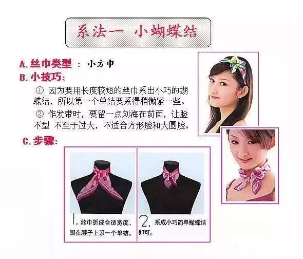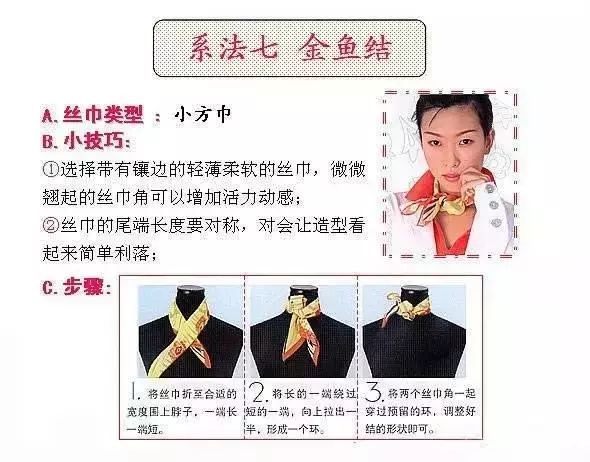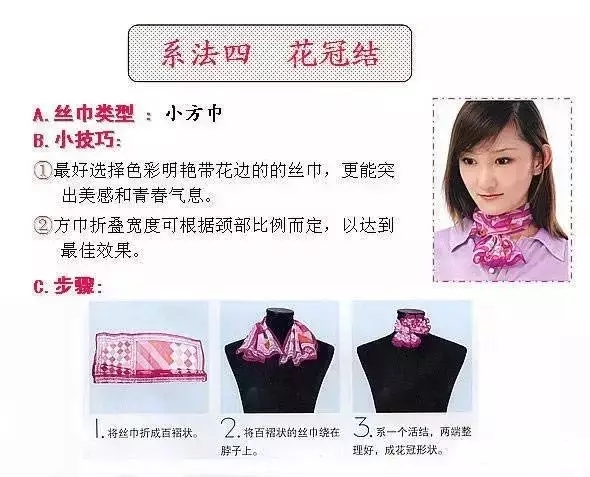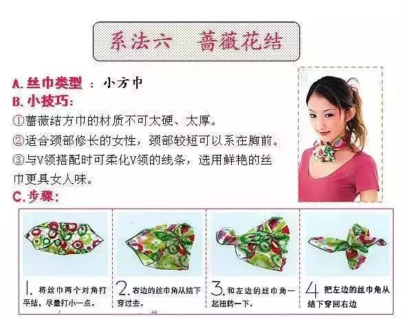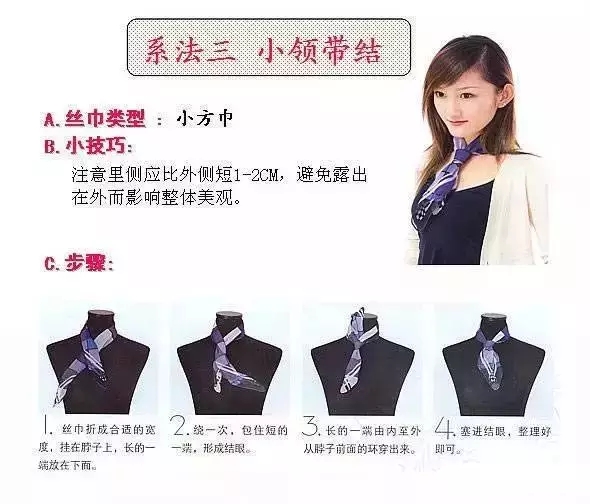 “絲巾”纏綿,絲絲入扣。一條小小的絲巾,可以打破職業(yè)裝的千篇一律,讓你瞬間秀出個(gè)性,流露優(yōu)雅。下面是一些小方巾的的常見(jiàn)系法,簡(jiǎn)單易學(xué),一共有七款,希望有一款最適合你哦。